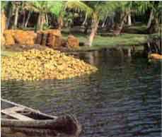 Gliding along the calm and serene backwaters flanked by green leaves and palms, seeing a rural Kerala preserved through the ages and completely hidden from the road is an enchanting experience to any visitor, more so while sailing a slow-moving, spacious Kettuvallam. Alumkadavu, a quiet spot in the town of Karunagapally - hardly 23 kms. North of Quilon (travel time: 30 min) has become a hot point of Kettuvallam building, with more than a hundred people involved. These huge, long and tapering barges were traditionally used to move tones of goods across kingdoms, with a portion covered with bamboo and coir serving as a rest room and kitchen for the crew. A familiar sight on the waters, these vessels are built entirely without using nails. Planks of jack wood are joined together with coir rope and coated with a caustic black resin made from boiled cashew kernels. With careful maintenance they last for generations.