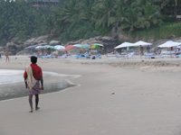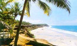 "Kovalam" means a grove of coconut trees and true to its name the village offers an endless sight of coconut trees. The crescent-shaped beach has three parts. The southern most beaches, and the most popular, are light house beach. It offers an amazing sight of Vizhinjam mosque. The northern Samudra is a laidback one and time, seems and stands still here. The middle, hawah, in the early day, is a beehive of activities with fishermen setting out for sea. With a high rock promontory and a calm bay of blue waters, this beach paradise creates a unique aquarelle on moonlit nights. Azure water and favorable climate make Kovalam a favorite year-round spot for swimming. Sea, here, is pacific and shallow where you can take a dip in the saline waters. Landlubbers will get lifeguards' service. The clean white sandy beach will arouse a temptation irresistible: to lie in idle on the sands and tan the body. Feeling a spent-cartridge after aquatics and beach activities. Get into an Ayurvedic massage centre-there are many such centres- and lie down on the wooden lath for an herbal, body-toning massage. To make the visit memorable, go for a shopping in handicrafts, jewellery and cloth shops spread across the shore. Food and accommodation suiting your purse is available along the beach.